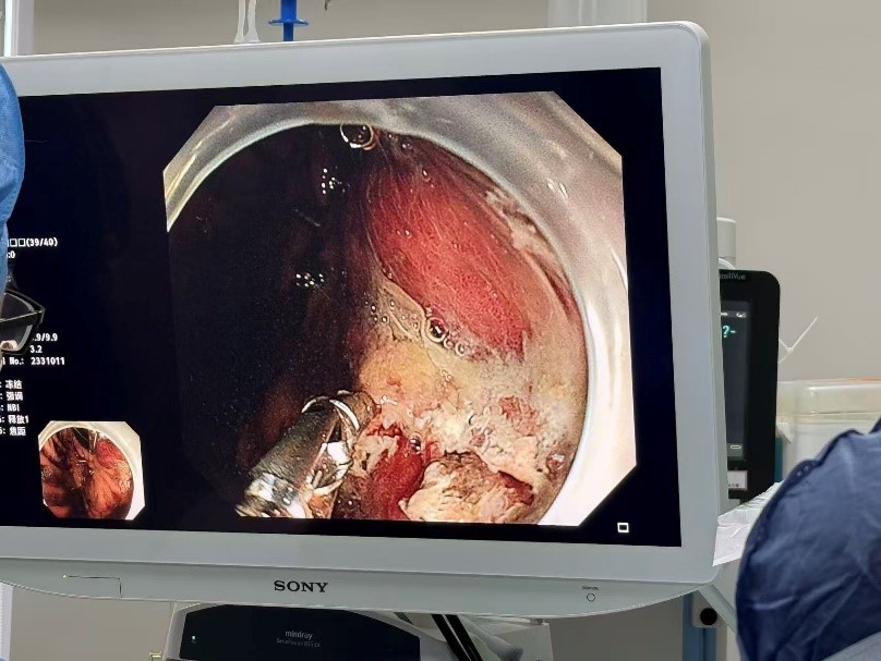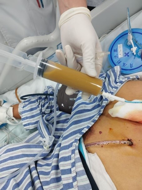 然而,考验接踵而至。韩阿姨突然出现致命的消化道大出血,口鼻和胃肠道不断涌出鲜血,血压难以维持。EICU迅速组织多学科会诊。消化内科医师团队立即施行急诊胃镜,发现了胃小弯侧存在的破口,危急时刻,普外科时林森副主任医师火速驰援,与家属沟通确认后,在ECMO支持下的极高风险中为患者进行胃穿孔修补术。术中清理血凝块达2000ml!术后第二天,患者血压再次持续下降,口鼻和胃肠减压管涌出了大量血液。耳鼻喉科医师在成功压迫患者口腔活动性出血点后,消化内科再次行急诊胃镜,并成功止血。随后,呼吸与危重症医学科曾大雄主任医师团队为患者进行纤支镜检查,吸取了堵塞韩阿姨呼吸道的大量脓痰。