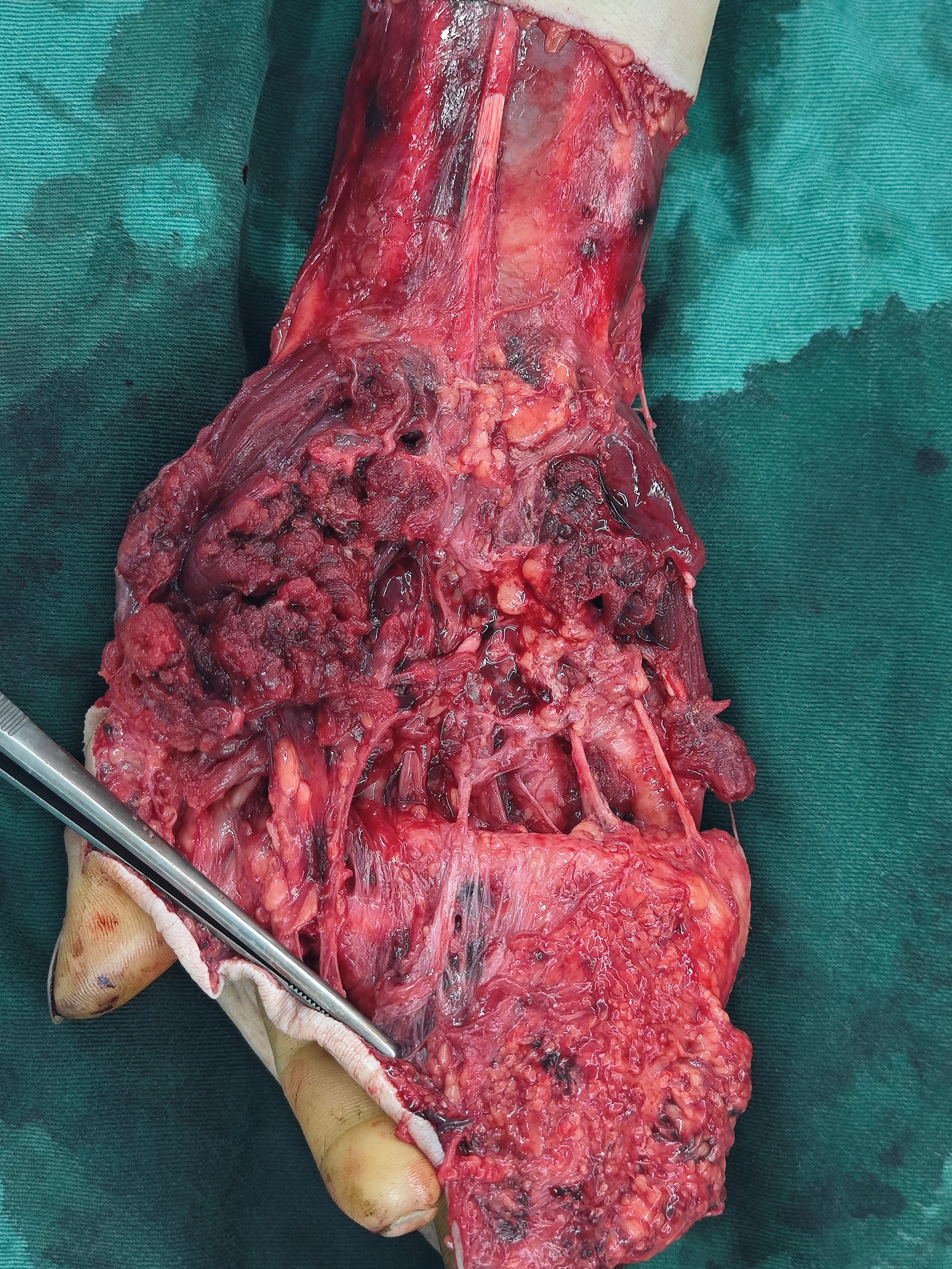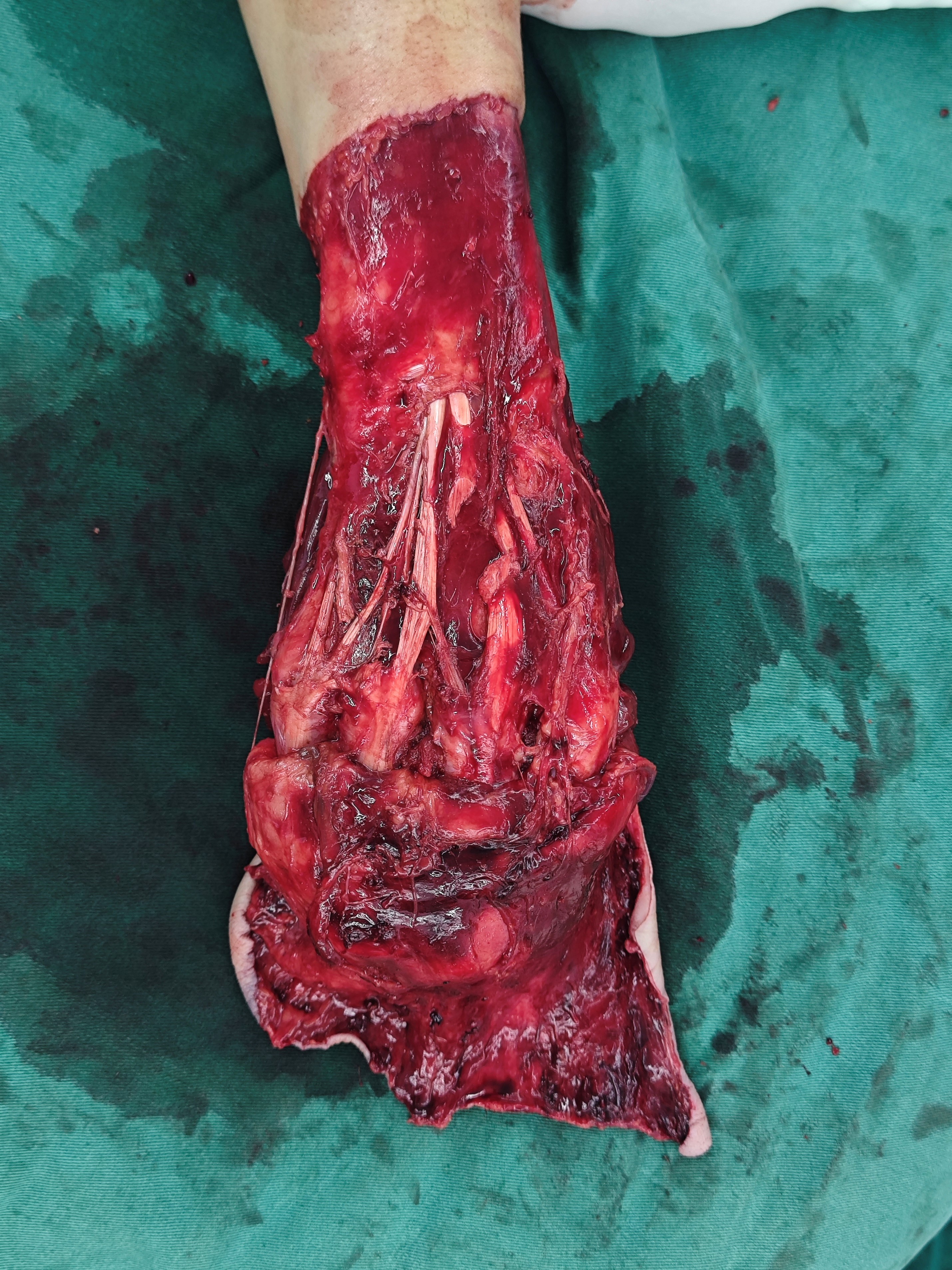 术中发现患者创面内布满大量异物,第五掌指关节已破裂且可触及异物,情况比预想的更为复杂。医护团队首先进行精细清创,仔细清除创面异物和坏死组织,随后精准止血,并逐一修复撕脱离断的肌腱组织。团队在复位脱套组织时发现该部位呈现明显淤紫,创面静脉断端有出血,而静脉回流能否重建,是帮助患者修复的关键。在高倍显微镜下,沈国良主任医师和张建超副主任医师带领团队开始了“绣花式”操作,他们先是小心翼翼地探查两侧静脉血管情况,随后凭借精湛的显微外科技术,前后吻合五对静脉。血管吻合完成后,原本淤紫的皮瓣逐渐红润,血运情况得到明显改善。