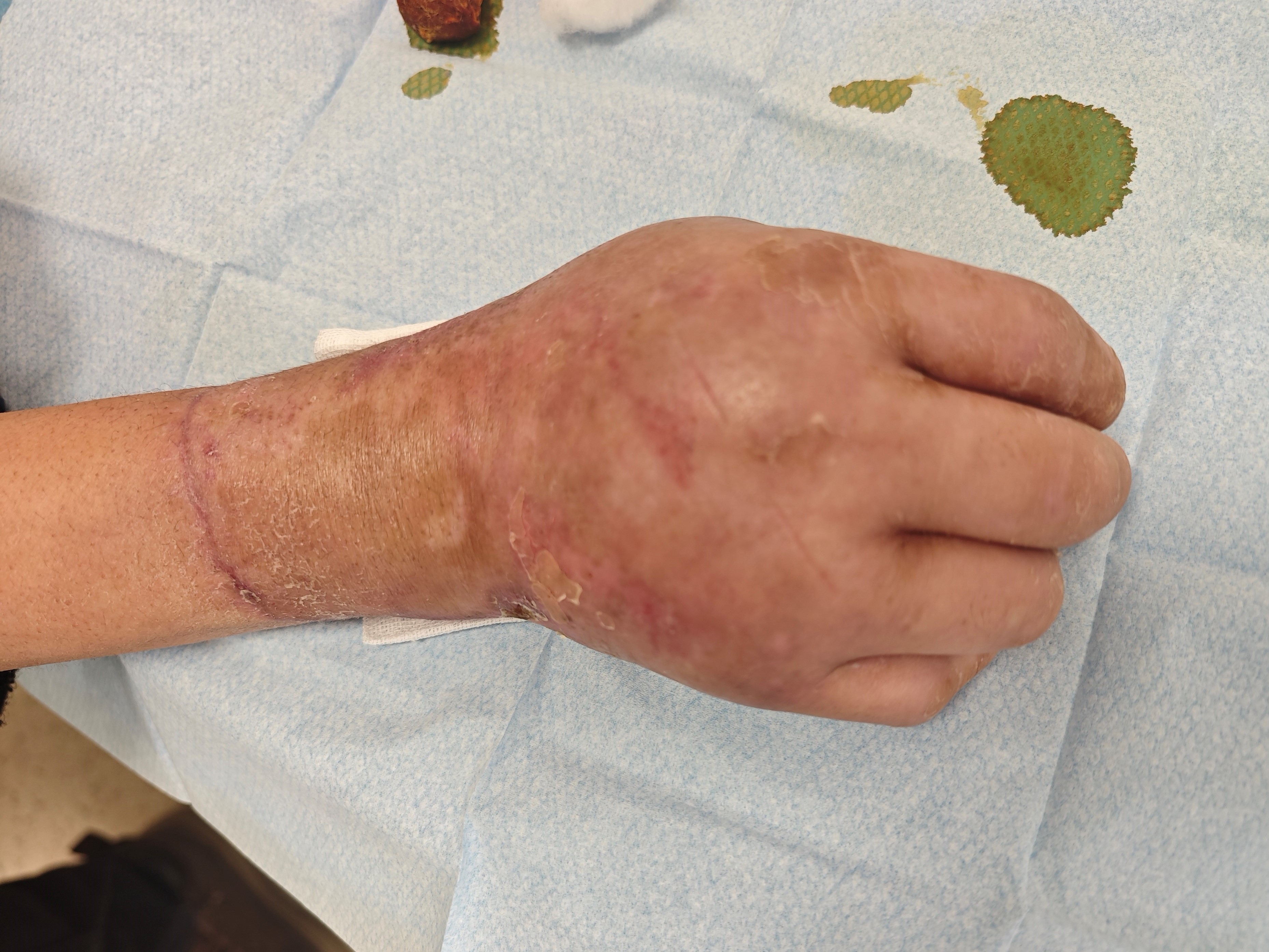 术后,科室为患者制定了严密的“三抗”治疗方案(抗凝血、抗痉挛、抗感染),医护团队24小时密切监测患者手部血运情况。经过精心护理,患者目前右上肢脱套组织血运、撕脱皮肤成活均良好,手指血运正常。现已逐步开展康复锻炼,帮助手部功能进一步恢复。