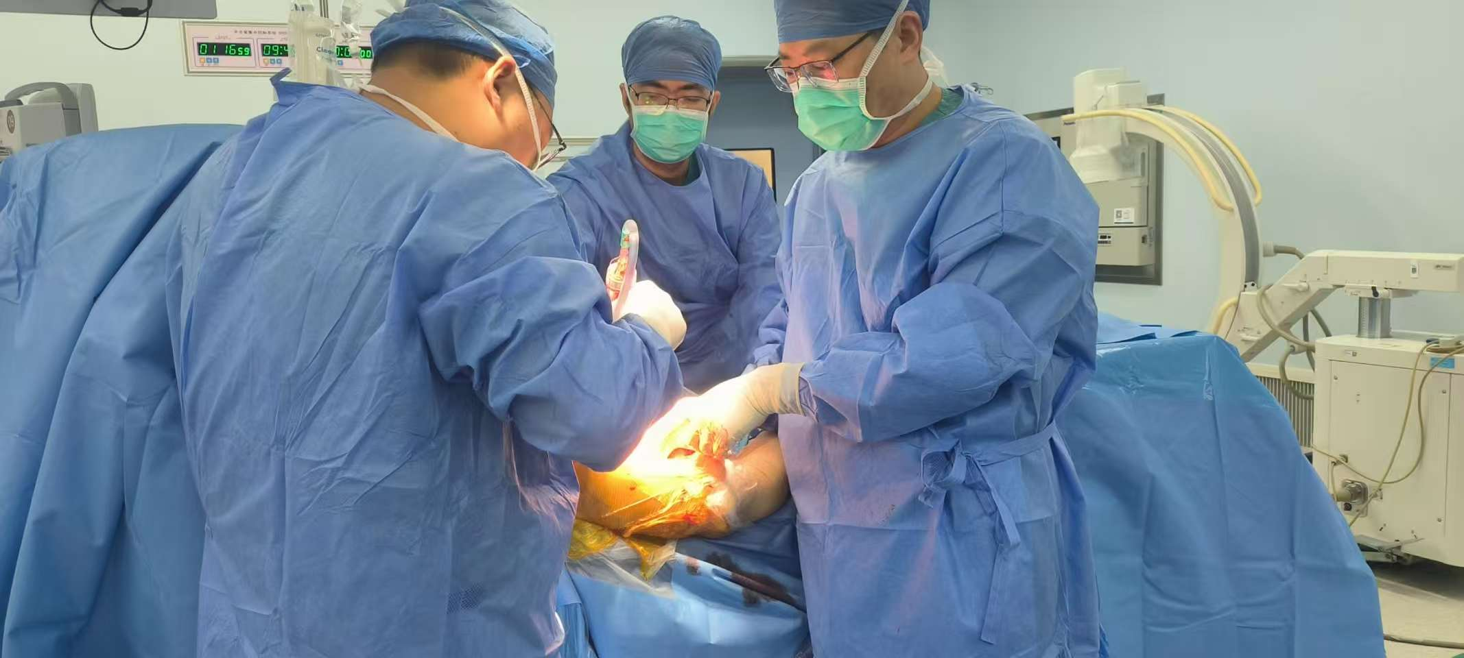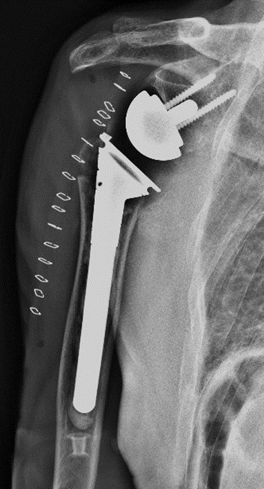 在麻醉手术科、输血科等科室的全力配合下,王亮副主任医师团队顺利取出骨折块,精确处理大小结节,安装关节假体,重建了肩关节的稳定性,整个手术过程顺利。术后复查X线提示假体位置良好,关节对位满意。