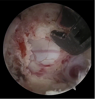 在完成了缜密的术前准备包括与患者家属充分沟通后,姜主任及团队在麻醉手术科的密切配合下开始了这场“刀尖上的舞蹈”。由于患者的齿状突游离且上颈段脊髓严重受压,麻醉后由仰卧改为俯卧的过程就十分危险,姜主任指挥团队小心翼翼地为患者完成了翻身,心电监视一切正常。由于上颈椎的特殊性,C1-2水平脊髓无骨性覆盖,易定位错误及穿刺误伤脊髓,团队也顺利地精准定位完成套管放置。手术在患者的颈后部做了两个各1cm的微小切口,精准到达目标区域后建立操作与观察通道,在高清内镜直视下磨钻去除部分C1后弓及C2骨组织,显露病变部位并进行射频止血,分离组织,切除增生的骨组织并不断重复。这一过程是对术者心理与体力的双重考验,团队精神高度集中,手术前后累计4个小时。